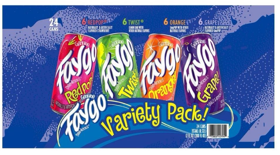 • 24 pack of 12 fl. oz. Cans flavors included: Grape, Orange, Red Pop, Twist